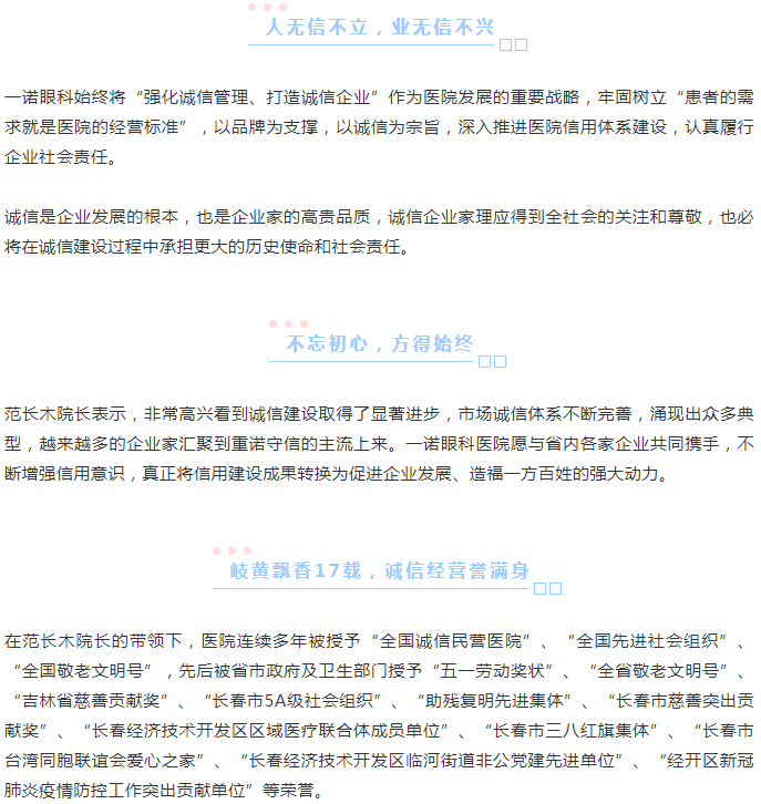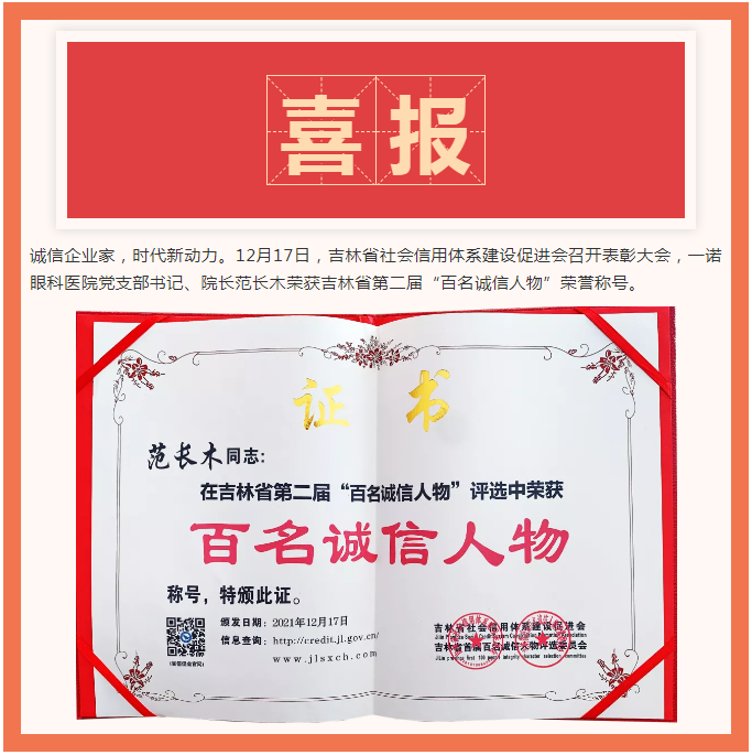 点赞!一诺眼科医院院长当选吉林省第二届“百名诚信人物”