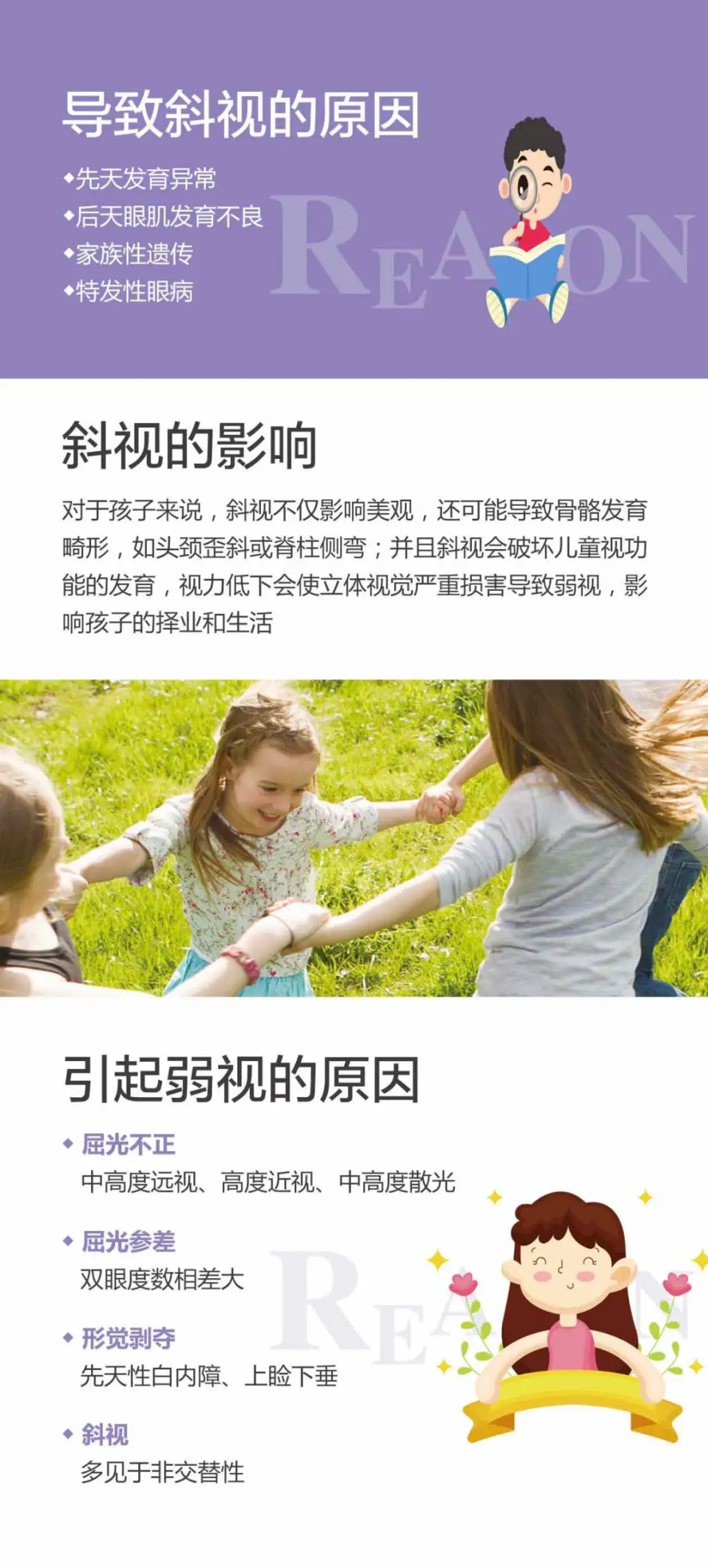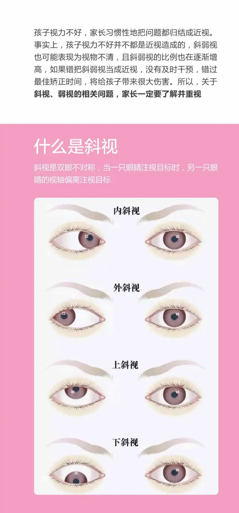 很多家长只了解近视,但是却忽略了青少年斜视、弱视的问题。随着斜弱视的比例的逐渐增高,家长对斜弱视的“陌生”,习惯性的把视力不好都通通归结为近视,导致很多孩子错过了最佳矫正时间。因此,斜视、弱视问题,家长要了解并重视。