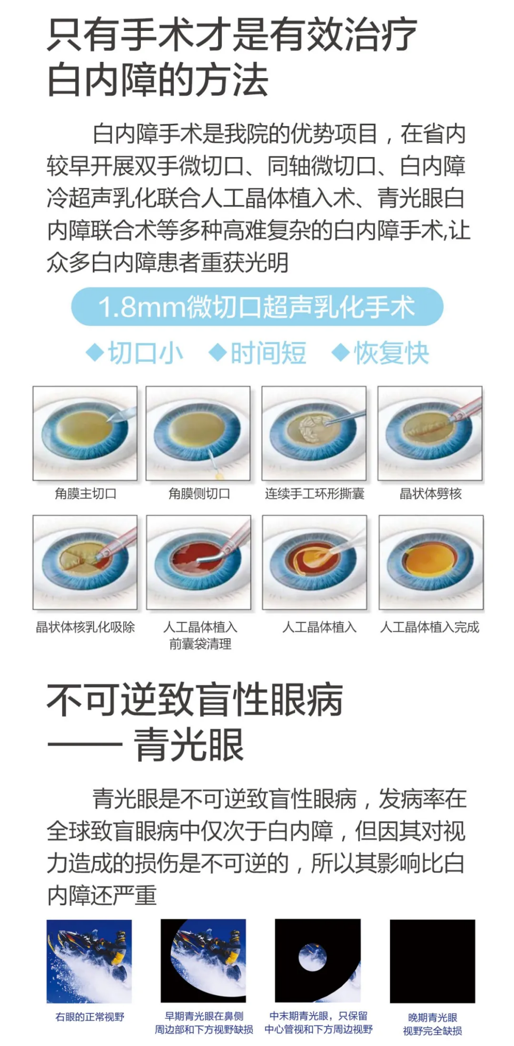 白内障手术是我院的优势项目,在省内较早开展双手微切口、同轴微切口、白内障冷超声乳化联合人工晶体植入术、散光晶体植入术、多